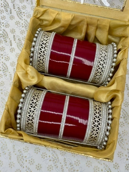 Trendy Design Chuda made with silver pearl pachelli bangles in the end with silver kangan on the sides surrounded by silver nikhars and all combined with blood red colored seep bangles