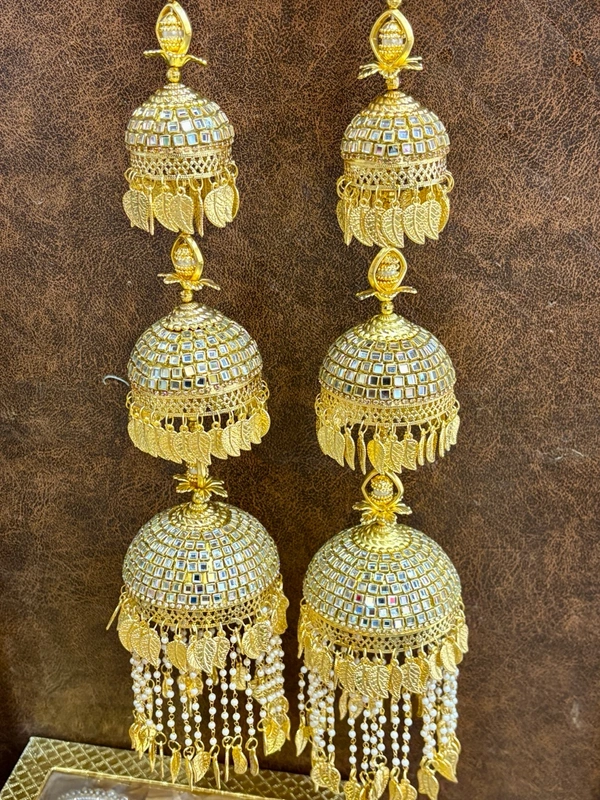 Make a royal bridal statement with our heavy multi-layer gold bridal kalira, meticulously handcrafted for brides who love rich tradition and grandeur. Featuring ornate engraved domes, layered jhumka detailing, delicate pearl chains, and elegant gold hangings, this kalira offers a luxurious and majestic look.