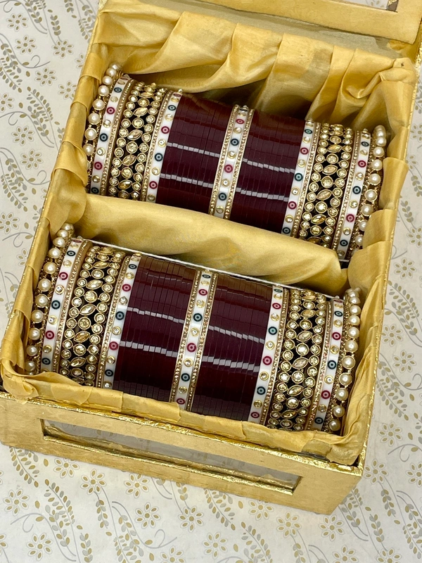 Beautiful dark colored chuda made with broad stone bangles on the sides along with golden pearls pachelli bangles and white dots bangles both on sides and in center of chuda but all are combined with dark maroon colored seep bangles