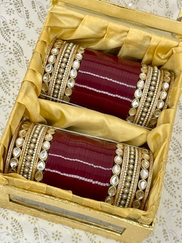 Beautiful design made with paan shaped kundan bangles on the sides with pearl bangles in the center if them and all are combined with light maroon colored seep bangles