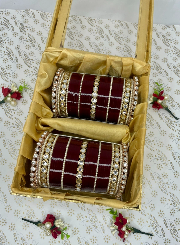 Beautiful combination of Round Kundan Kangan and Crystal Pachelli Kade along with white pearl chudi and blood red tradrional seep bangles