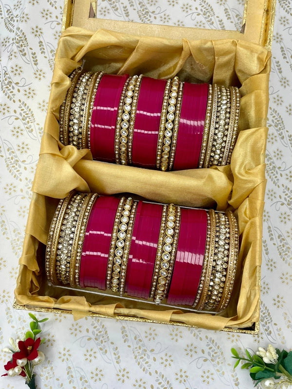 Trendy Design made with beautiful Crystal Kangans on the sides along with golden nikhars and pearl bangles, and round stone bangles in center surrounded with golden pearl bangles. All combined with magenta colored tradtional seep bangles