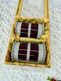 Silver Pearl Pachelli Bangles clubbed with white Nikhars and Flower pattern Traditional Seep Bangle along with dark maroon bangles making this chuda a true masterpiece.