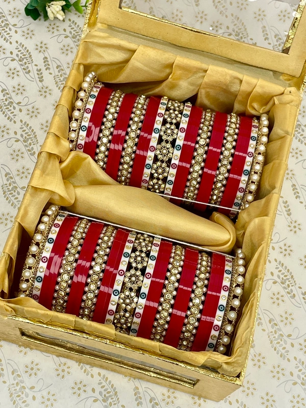 Elegant bridal chuda design made with pealr oachelli bangles on the sides along with kundan dots bangles and pearl stone bangles in the center and one flower pattern kangan in the center of chuda and all attached with blood red colored seep bangles