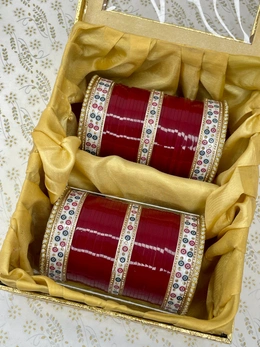 Simple ye elegant design best for daily wearing, specially made with pearl seep bangles on the end along with traditional white dots bangles and golden nikhars and all combined with blood red colored seep bangles