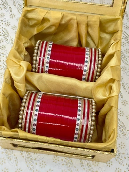 Very Decent Chuda made with pearl bangles on the outer side and both golden and silver nikhars on the sides and tomato red bangles in the center