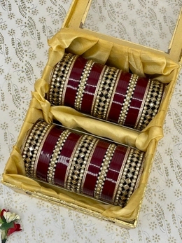 Very elegant and heavy design made with three broad kangan with golden nikhar on the sides for one hand, and pearl stone bangels in the center and all are attached with light maroon colored seep bangles