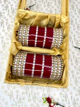 Round Kundan Kangans Centered in Silver Stoned Traditional White Seep Bangles and Pearls Kangan at the end, all combined with blood red chudiyan