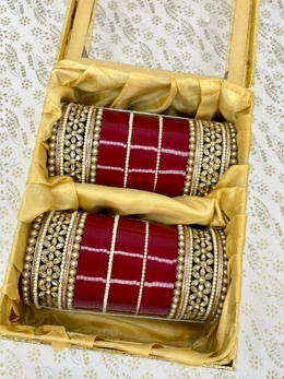 Amazing Flower Design Kangans along wih pearl bangles and kangans on sides with golden Nikhars for detailing and pearl bangles in center also, all combined with blood red seep chuda bangles makes this a fabulous design