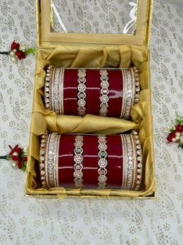 Stunning Ad Bangles with dual colored Ad stone in center of chuda and Same finish Crystal Pachelli bangles at the end with Rose gold polish crystal bangles on sides, all combined with traditional Blood red Seep Bangles.