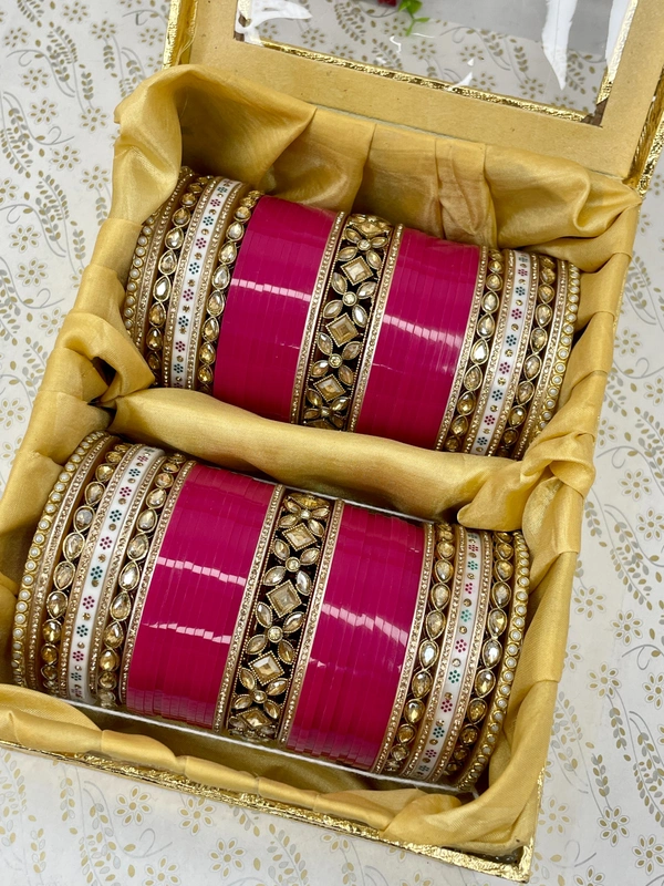 Beautiful magenta colored bridal chuda made with broad center kangan and kundan bangles on the sides which are surrounded by golden nikhar and flower pattern dots bangles