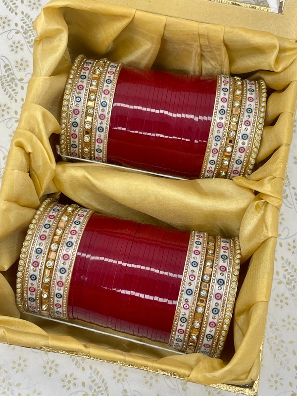 Beautiful Bridal chuda made with golden metal bangle on the sides along with white dots and golden nikhar banglesa and pearl seep bangles on the sides