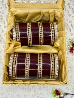 Elegant round bangles in center and square shaped bangles in the end along with traditional stone studded white bangles and golden nikhars around bangles for nicer look