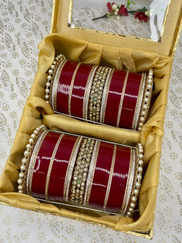 Beautiful design made with single broad crystal bangle in the center and golden pearl pachelli bangles on the sides and all combined with traditional red colored seep bangles