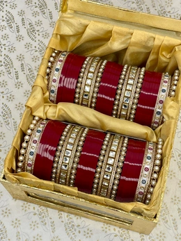 Exquisite Kundan Bridal Chuda made with square kundan bangles in the center aldng with pearl bangles and golden nikhars and golden pearl pachelli bangles in the end and all are attached with blood red seep bangles