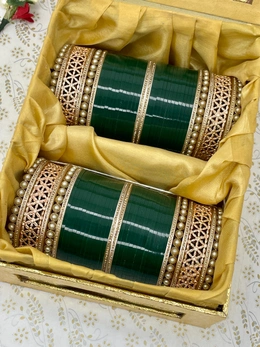 Budget Friendly Design made with flower pattern bangles and pearl bangle on the sides and all combined with dark green colored seep bangles