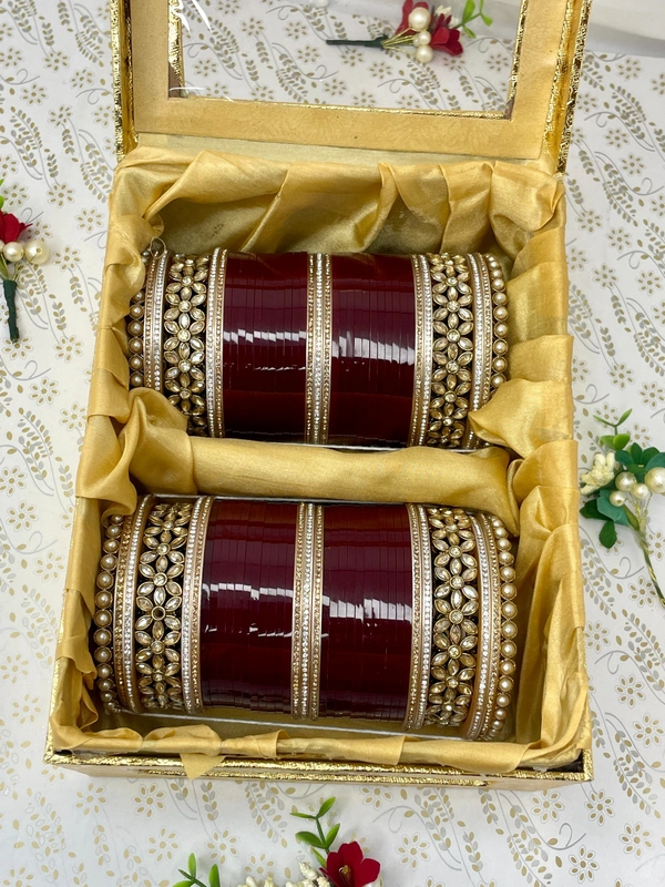 Very elegant Flower Pattern bangles surrounded with both golden and silver nikhars and pearl bangles at the end all combined with traditional blood red seep bangles