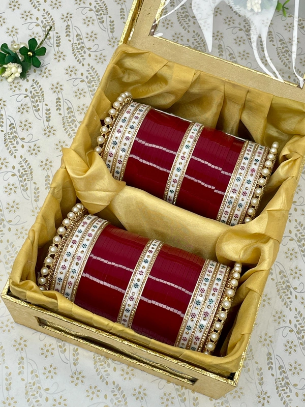Simple yet elegant design made with pearl pachellli bangle in the end and traditional white flower dots bangles along with golden nikhars and all combined with blood red seep bangles