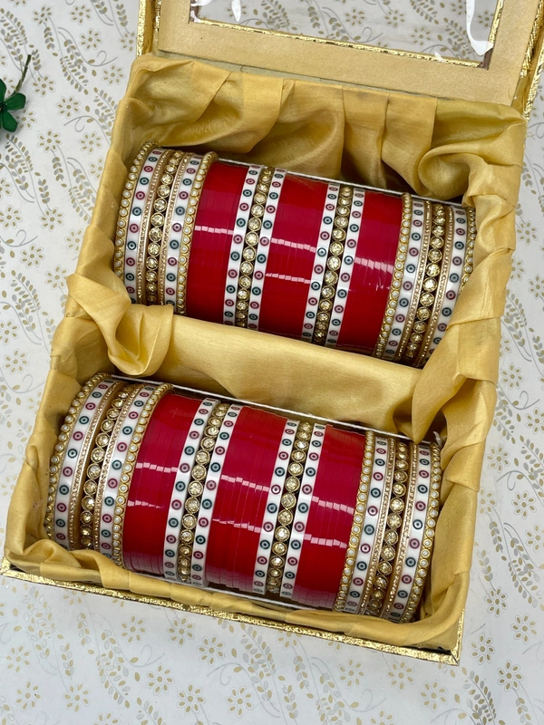 Very Elegant design made with round stone bangles surrounded by traditional white dots bangles and golden nikhars, and all combined with traditional blood red seep bangles