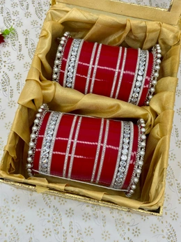 Trendy Silver Pearl Pachelli Kangan in the end along with Crystal Kangans centered in White Nikhars, all combined with tomato red Seep bangles