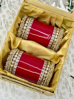 Simlple yet elegant bridal chuda made with bajre kade in the end and kundan bangles along with pearl bangle and all combined with bright red seep bangles