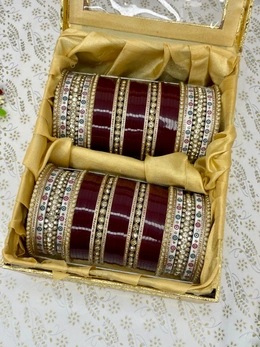 Very Uniquely designed chuda with traditional white stone bangles on the sides of crystal kangan and in center of chuda two round stone bangles which are also surrounded by golden nikhars, and all combined with dark maroon colored seep bangles