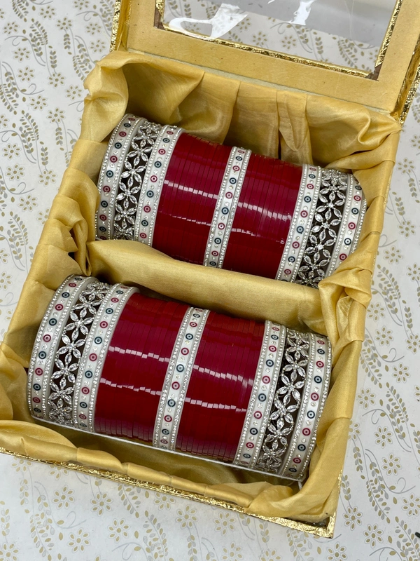 Beautiful AD flower pattern kangan surrounded by white nikhar and silver stone white dots bangles and all are combined with blood red traditional seep bangles