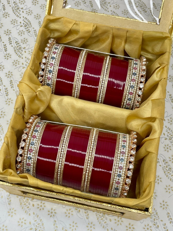 Beautiful design made with crystal pachelli bangles on the end along with traditional white dots bangles surrounded by pearl bangles and golden nikhar in the center