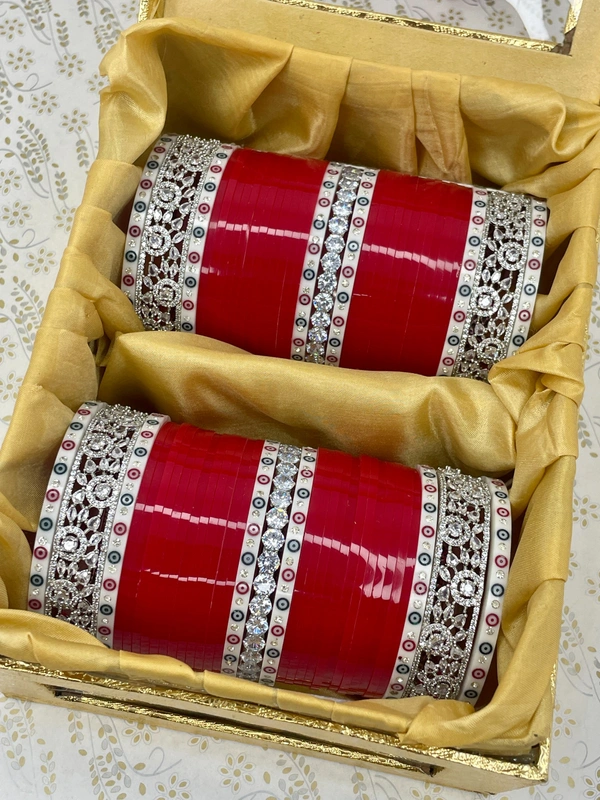 Astonishing AD Silver Kangans on the sides along with crystal bangle in the center and all surrounded by traditional white dots bangles and bright red colored seep bangles
