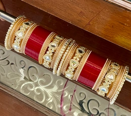 Trendy Uncut Kundan Kangans along with same kunda Pachelli bangles on the sides and pearl bangles