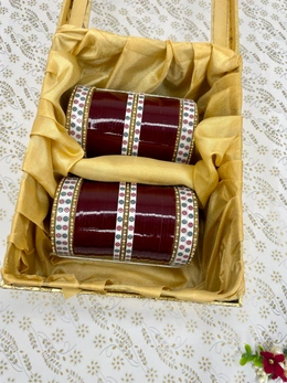 Made with traditional colored seep bangles and dotted white bangles centered with golden metal bangle