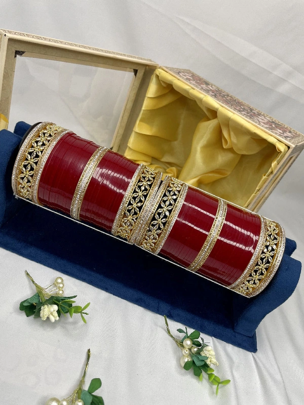 Flower Cut American Diamonds Kangans in Golden Polish paired with Golden & Silver nikhars, combined with seep rounded bangles to give extra finish to this bridal chuda for your most special day.