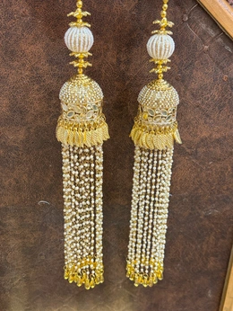 Add regal charm to your bridal attire with our long pearl bridal kalira, beautifully crafted for brides who love timeless tradition and graceful detailing. Designed with an ornate gold-finish dome, intricate cutwork patterns, and cascading pearl strands, this kalira creates a rich, flowing look that enhances every bridal movement.