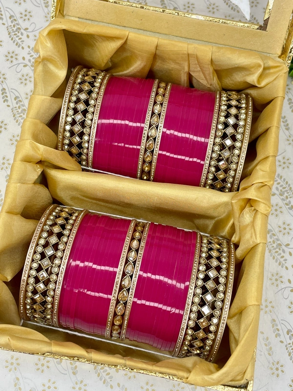 Beautiful Magenta colored chuda with broad kangans in the end along with golden nikhar and one kundan bangle in the center