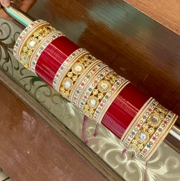 Kundan Bangles on the sides along with star pattern dots bangles and cherry red bangles