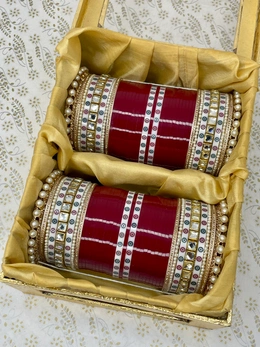 Beautiful Kundan Bridal Chuda with traditional white dots bangles and golden pearl pachelli bangles in the end and with pearl bangles along with golden kundan bangles