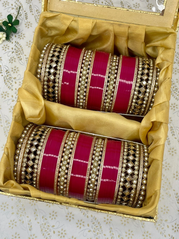 Beautiful designed chuda in rani color made with pearl stone studded bangles in the center along with golden nikhars and broad kangans on the sides with pearl bangles in the end