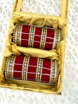 Mehndi polish Kundan Kangans in center and pearl kangans at the sides with Golden Nikhars and stone Bangles used for detailing, all blended in blood red seep chuda bangles