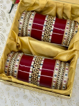 Extra Ordinary Designer Chuda made with beautiful flower cut design bangle in the center and mehndi polish stone bangles on the sides all surrounded by stone studded traditional white dots seep bangles and blood red colored seep bangles.