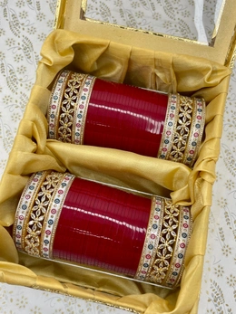 Trendy flower pattern AD Kangans surrounded by tradititional white dots bangles and silver nikhars along with blood red colored seep bangles