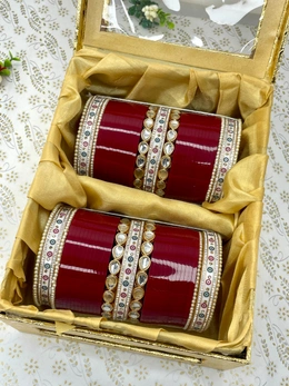 Traditional White dots bangles with silver stones surrounded with pearl bangles and golden nikhars and kundan bangles in the center all combined with blood red seep bangles.