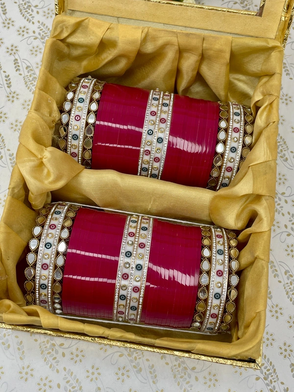 Beautiful Mirror look bridal chuda in magenta color bangles and traditional white dots stone studded bangles and golden nikhars.