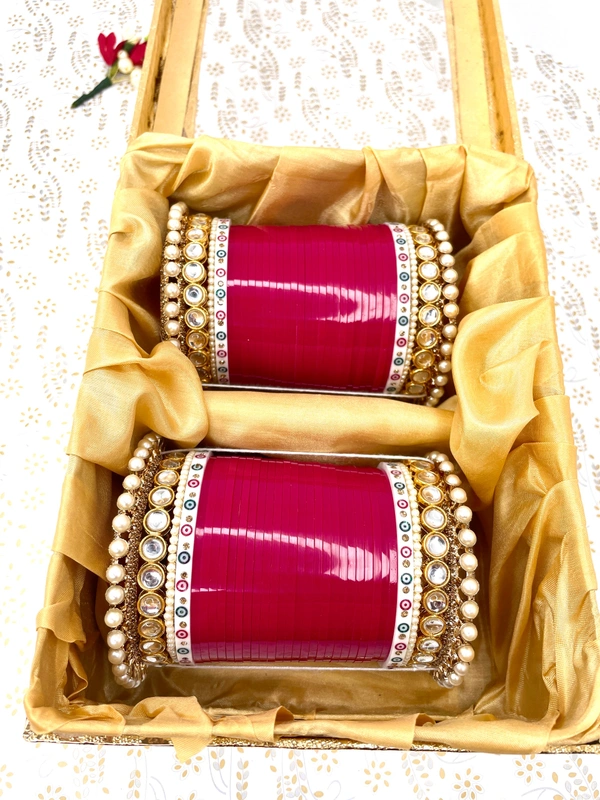 Golden Pachelli Pearl Bangles clubbed with Round Kundan Bangles and with small Pearl chudi and traditional Dotted bangles, all combined with Magenta Colored bangles