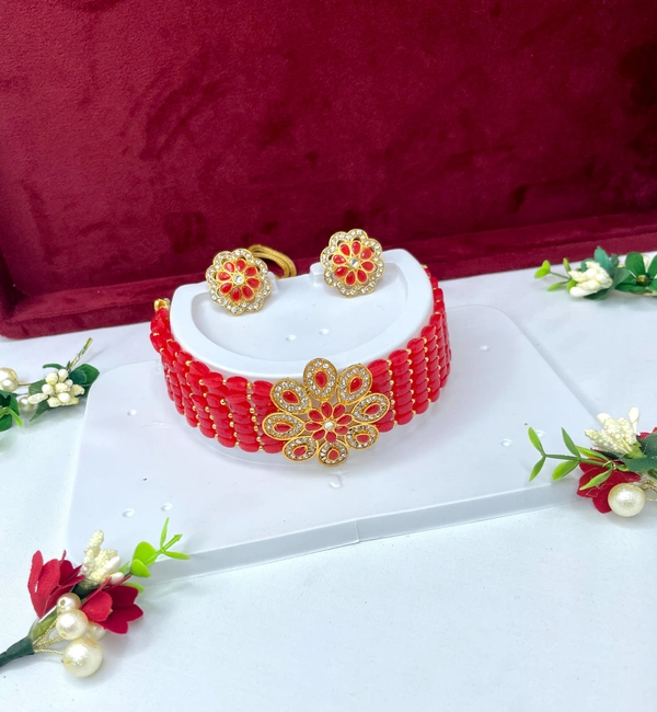 Get this elegant Flower Pattern with red stones with amazing red crystals mala along with beautiful studs which will give u the best party look