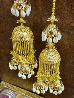 Elevate your bridal look with our gold bridal kalira, exquisitely crafted to reflect timeless Punjabi wedding traditions. Designed with ornate engraved domes, layered gold chains, and elegant white shell detailing, this kalira creates a rich and graceful statement for your special day.