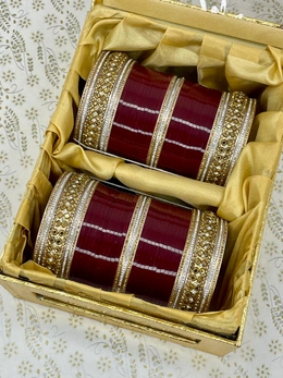 Seep Kangan with kundan stones along with Golden and Silver Nikhar paired with maroon bangles.