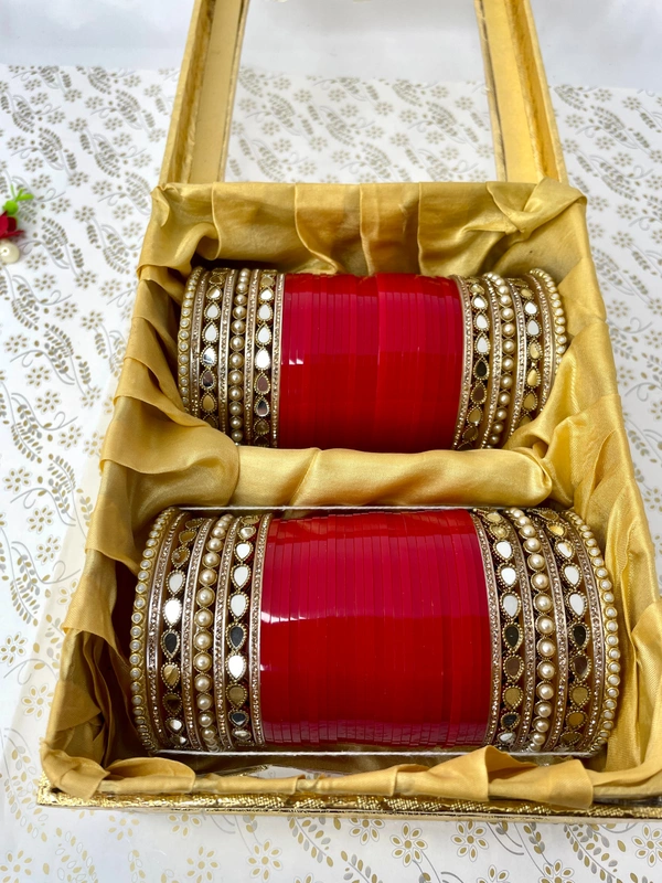 Amazing Mirror Bangles separated with Pearl Bangles and centered in golden nikhar and peal seep bangles in end completed with red seep bangles
