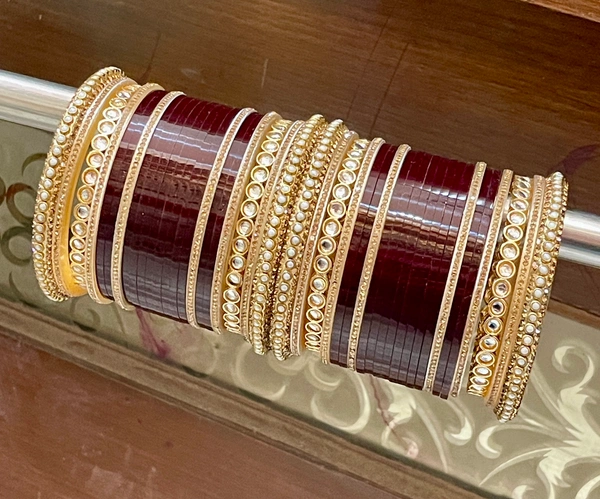 Beautiful Kundan Shirt Chura with pearl bangles on the sides along with dark maroon bangles in center