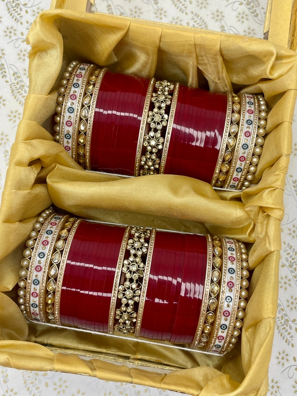 Very Preety design made with pearl bangles on the sides along with white dots and kundan bangles which are surrounded by golden nikhars and one flower cut designed bangle in the center with golden nikhar on its sides. And all combined with blood red seep bangles
