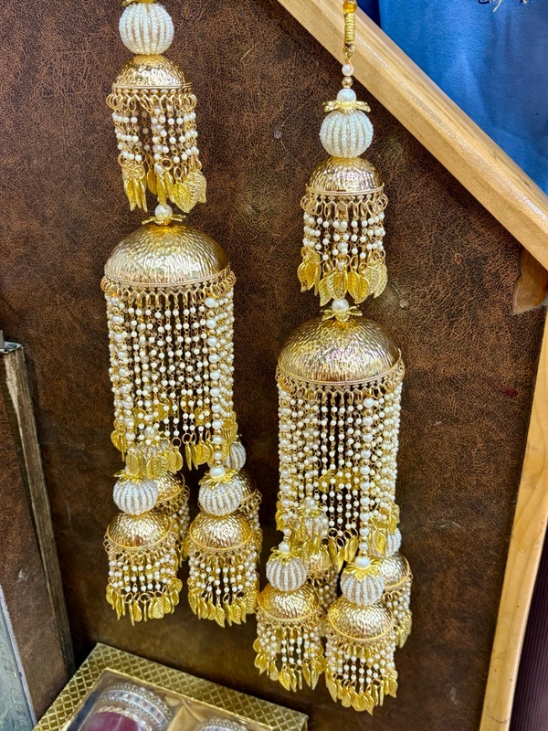 Celebrate your bridal journey with our luxurious gold-finish bridal kalira, handcrafted to perfection for the modern Punjabi bride. Designed with multiple dome layers, intricate engravings, delicate pearl chains, and elegant leaf charms, this kalira beautifully blends royal tradition with timeless elegance.